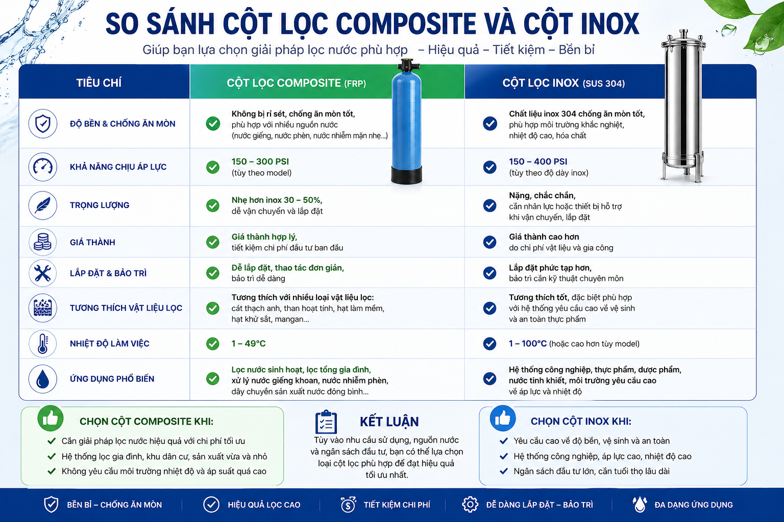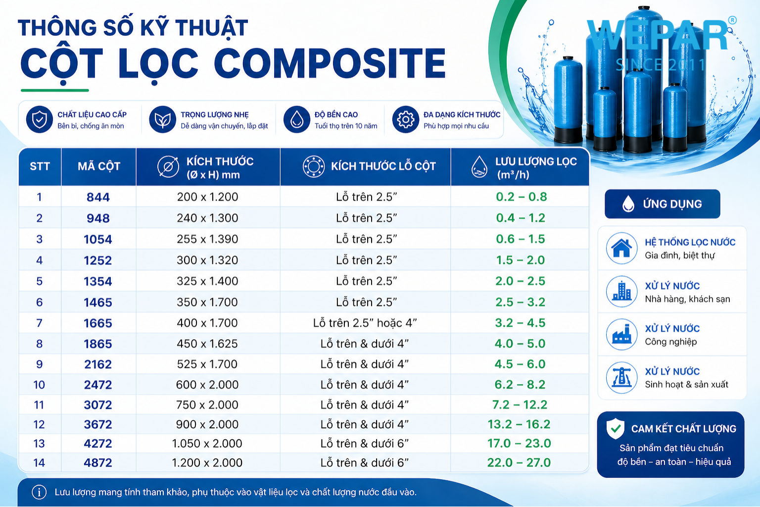 WEPAR cung cấp đa dạng các loại cột lọc composite màu xanh với nhiều kích thước khác nhau, phù hợp từ hộ gia đình đến hệ thống công nghiệp.