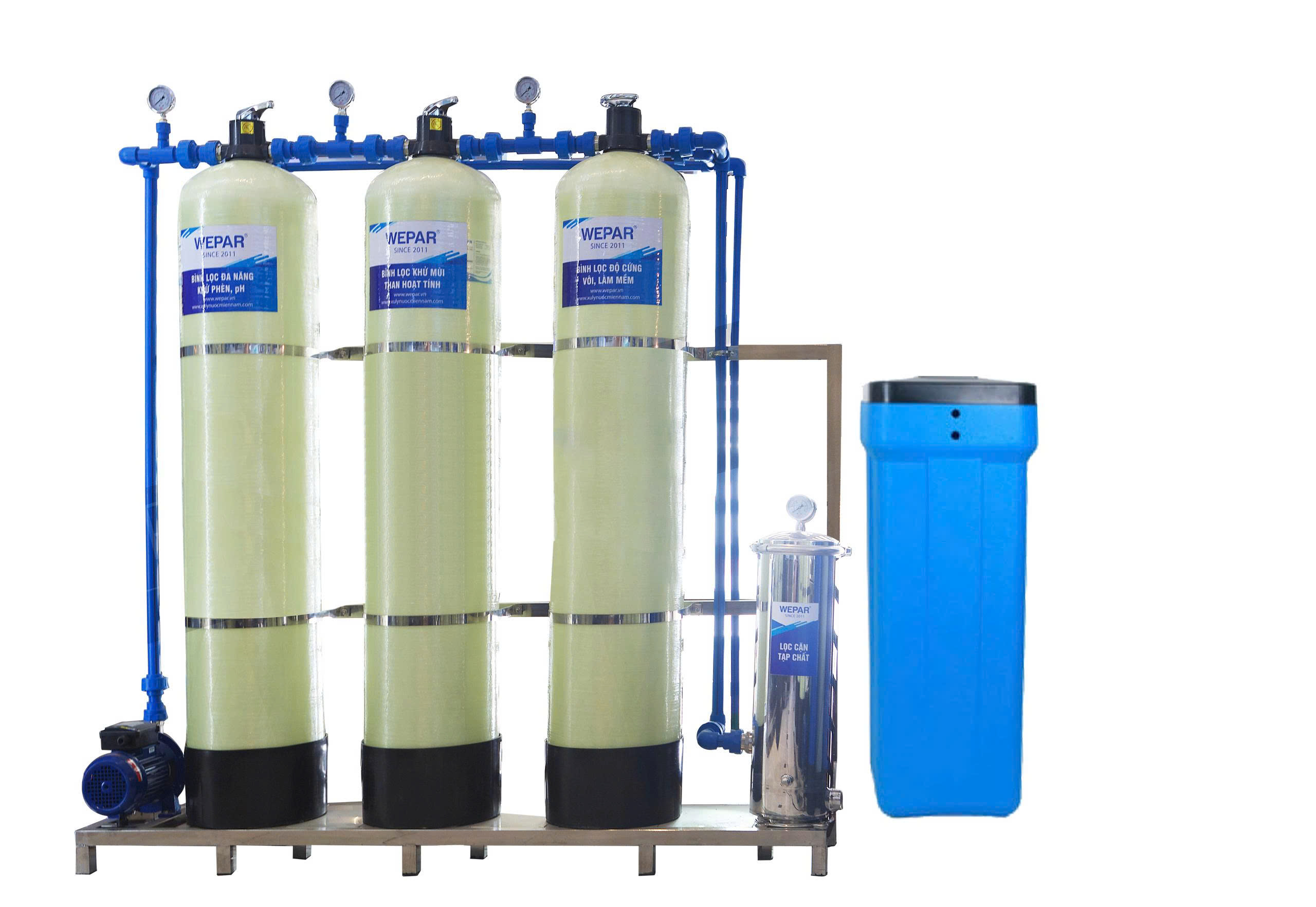 Cột 3: Hệ thống xử lý độ cứng, làm mềm nước, khử vôi, bằng phương pháp trao đổi ion, chuyển ion kim loại kiềm thành ion Na+ bảo vệ màng lọc RO, có tác dụng làm mềm nước.