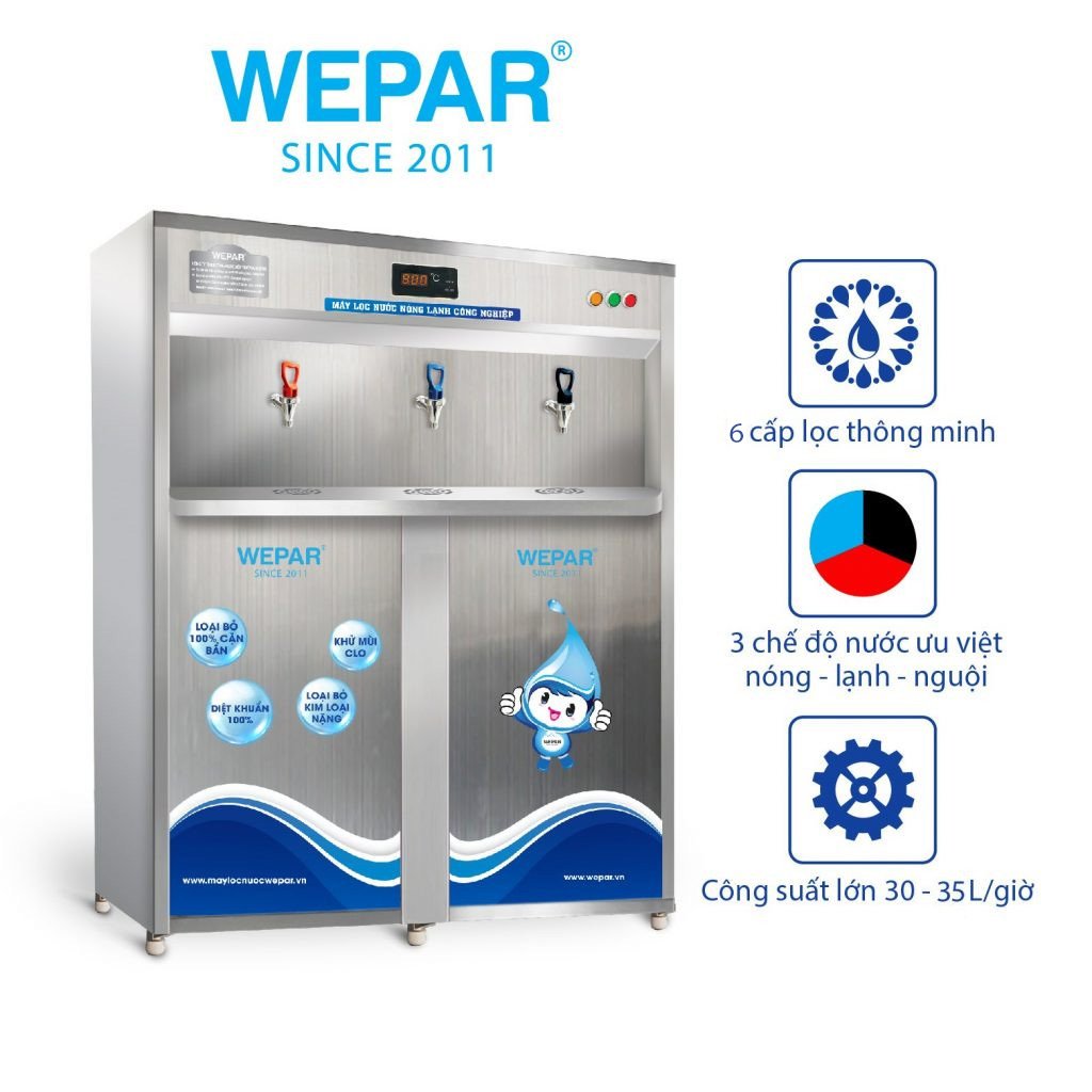 Máy lọc nước RO bán công nghiệp 3 vòi nóng – lạnh – nguội được thiết kế 06 cấp lọc, Công suất lọc RO: 50 lít/h, Công suất nóng: 10 lít/h, Công suất lạnh: 20-25 lít/h – có bình áp 32 Gallon. Được bảo vệ bởi tủ Inox chắc chắn, chống gỉ sét cao.
