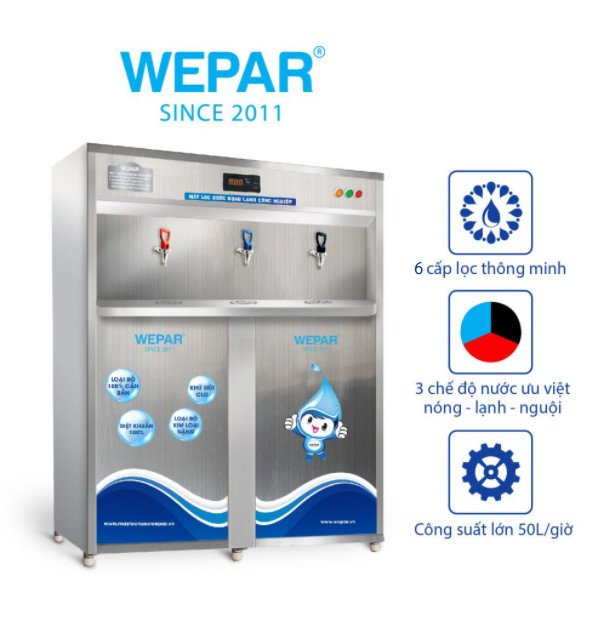 Máy lọc nước RO bán công nghiệp 3 vòi nóng – lạnh – nguội được thiết kế 06 cấp lọc, công suất hoạt động 50 lít/giờ – có bình áp 32 Gallon. Được bảo vệ bởi tủ Inox chắc chắn, chống gỉ sét cao.