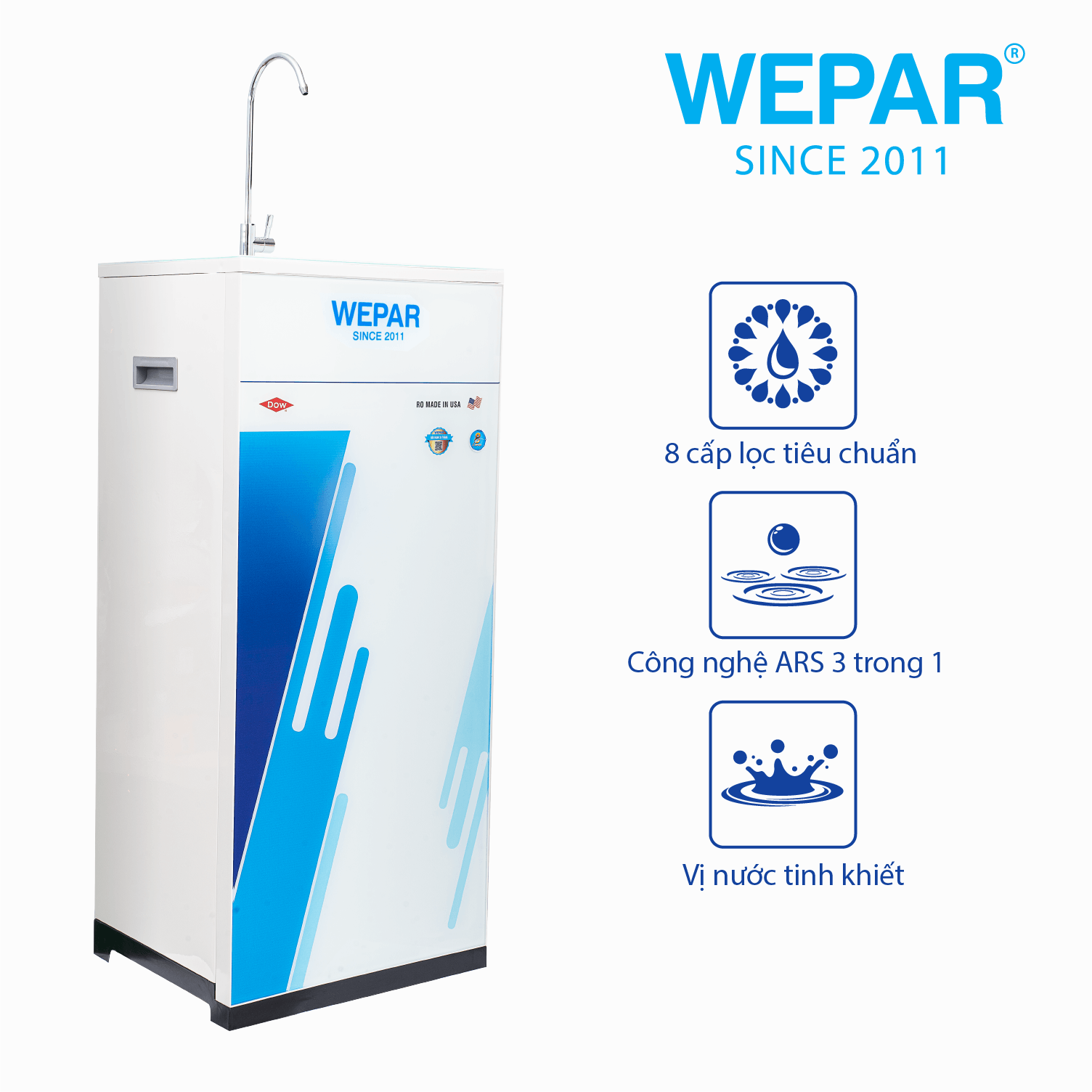 Thương hiệu WEPAR cho ra mắt dòng MÁY LỌC NƯỚC RO 8 cấp WEPAR với nhiều ưu điểm vượt trội; 8 cấp lọc mạnh mẽ mang đến nguồn nước tinh khiết, an toàn và chất lượng.