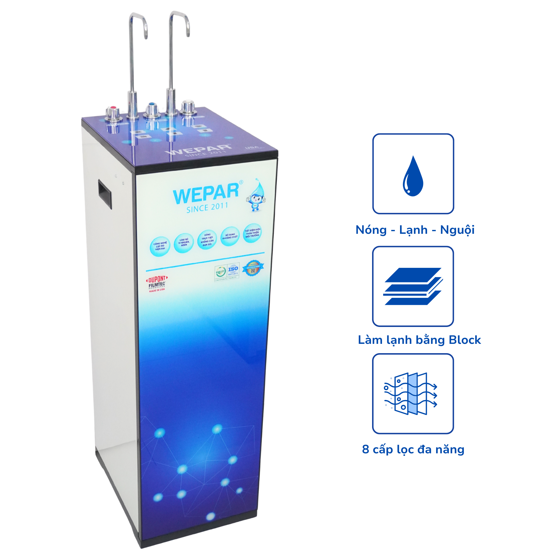 Gia đình hiện đại cần một giải pháp toàn diện để đảm bảo nguồn nước sạch, an toàn và tiện lợi trong sinh hoạt hàng ngày. Máy lọc nước RO Wepar nóng – lạnh – nguội 2 vòi màu xanh là sự lựa chọn hoàn hảo, đạt chuẩn chất lượng nước uống trực tiếp của Bộ Y tế, bảo vệ sức khỏe cho mọi thành viên trong gia đình.