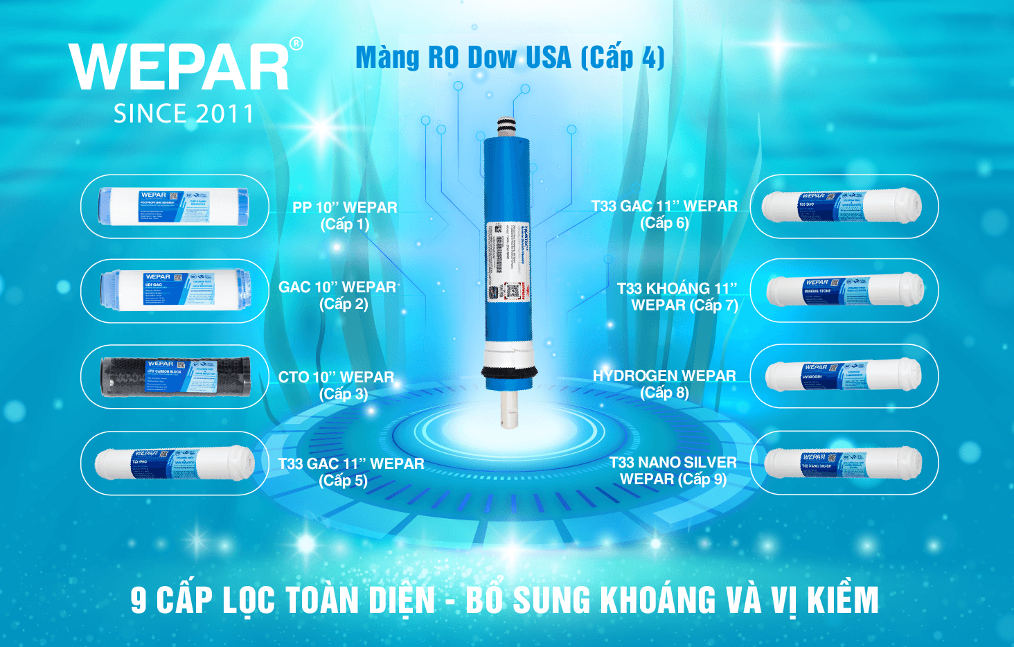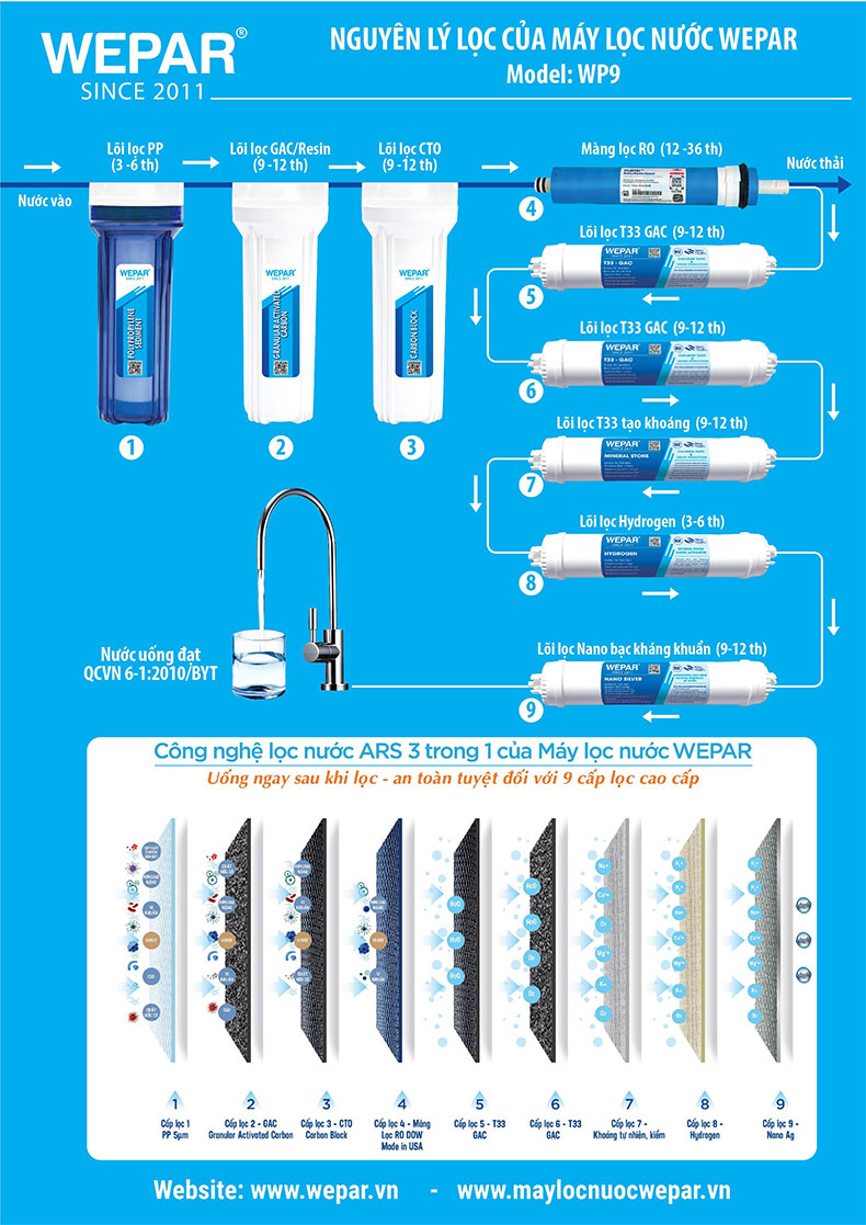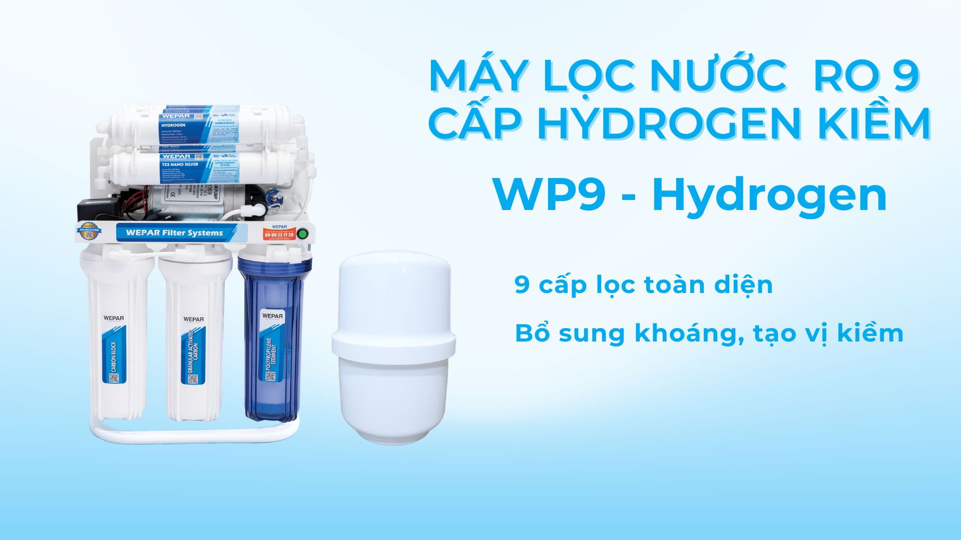 Máy Lọc Nước RO WEPAR cao cấp với 9 cấp lọc – WP9 Hydrogen – uống trực tiếp không cần đun sôi, bổ sung khoáng và vị kiềm tốt cho sức khỏe.