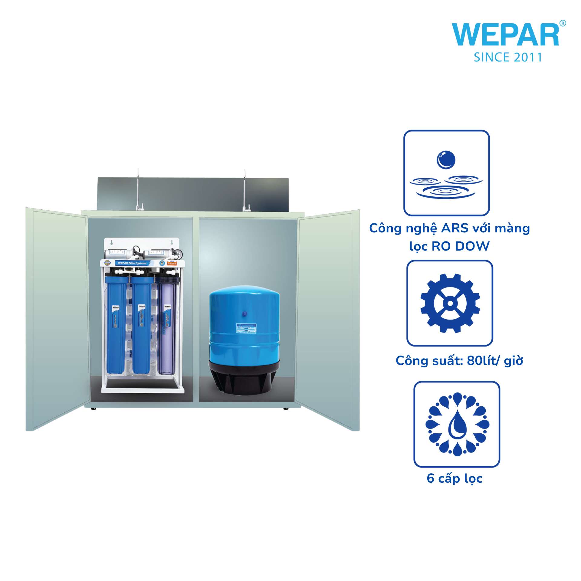 | Cấp lọc 3 | Lõi CTO Wepar 20 inch | Là lõi lọc tích hợp khả năng lọc cặn và lọc mùi. Giúp lọc cặn, xử lý mùi triệt để trước khi nước đi vào màng lọc RO. |