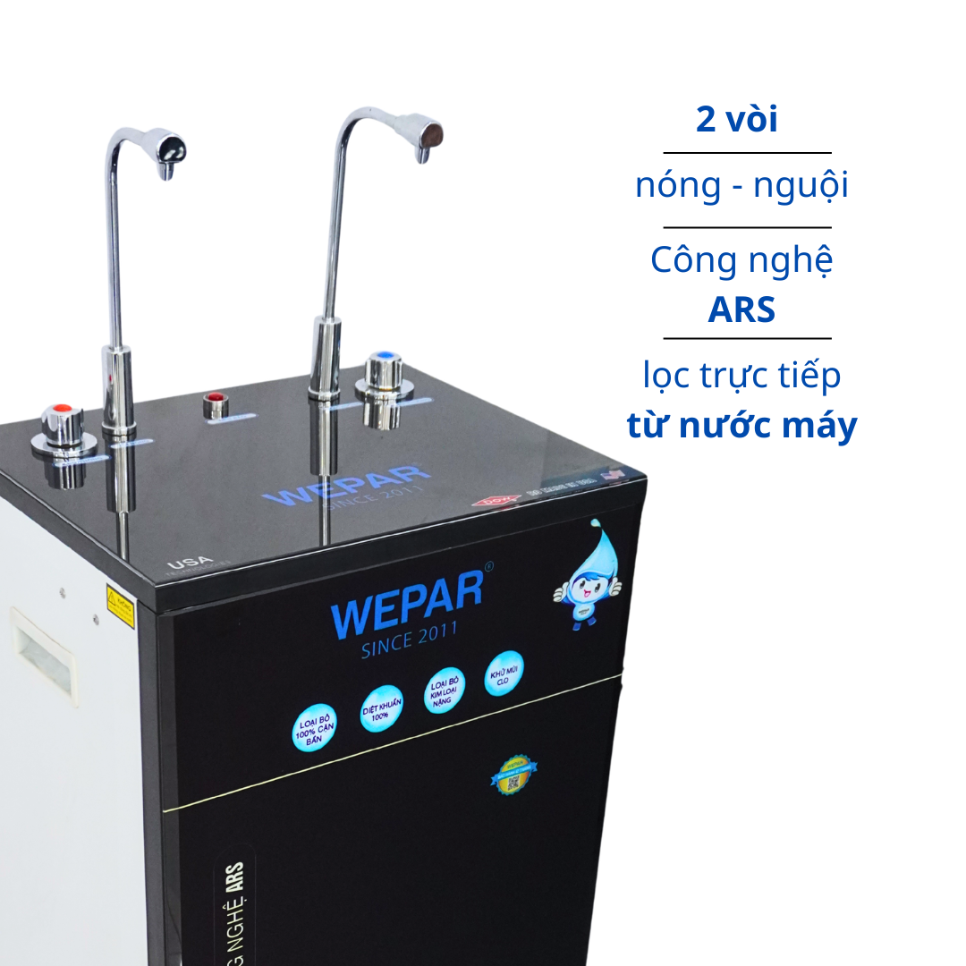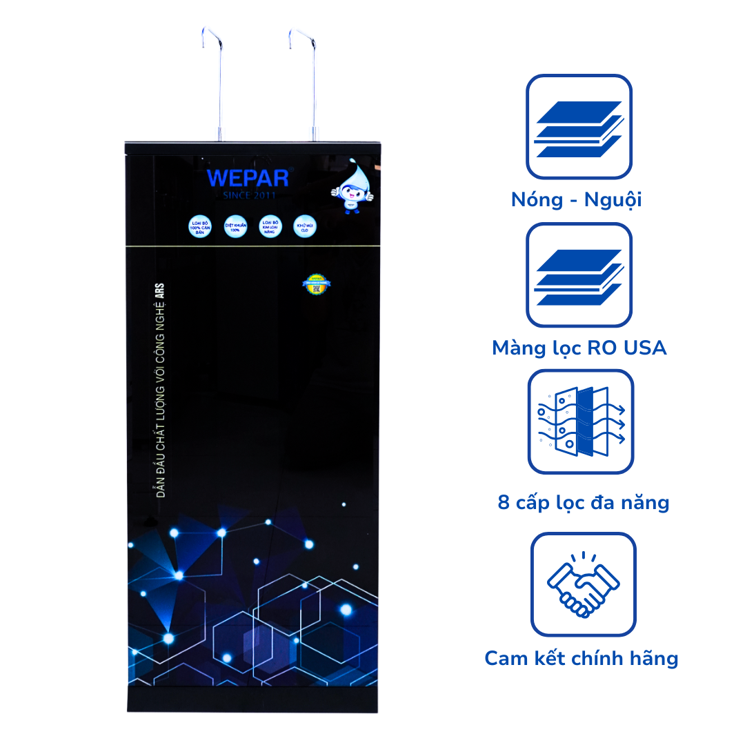 Sử dụng máy lọc nước nóng nguội làm mềm nước RO Wepar giúp mang lại nguồn nước sạch an toàn, đạt chuẩn chất lượng nước uống trực tiếp của Bộ Y tế. Với thiết kế nhỏ gọn, sang trọng nhưng mang lại công năng mạnh mẽ. Máy lọc với 2 nguồn nước: nguồn nước nóng và nguồn nước nguội, phục vụ đa dạng nhu cầu sử dụng cho các gia đình, các cơ quan, văn phòng, công ty,…